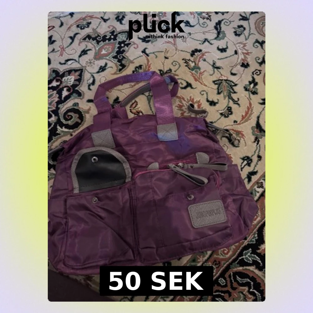 Cool lila handväska i nylon med flera fickor framtill och grå detaljer. Väskan har dubbla handtag och dragkedjor, samt en logotyp på framsidan. Perfekt för dig som gillar praktiska och snygga accessoarer.