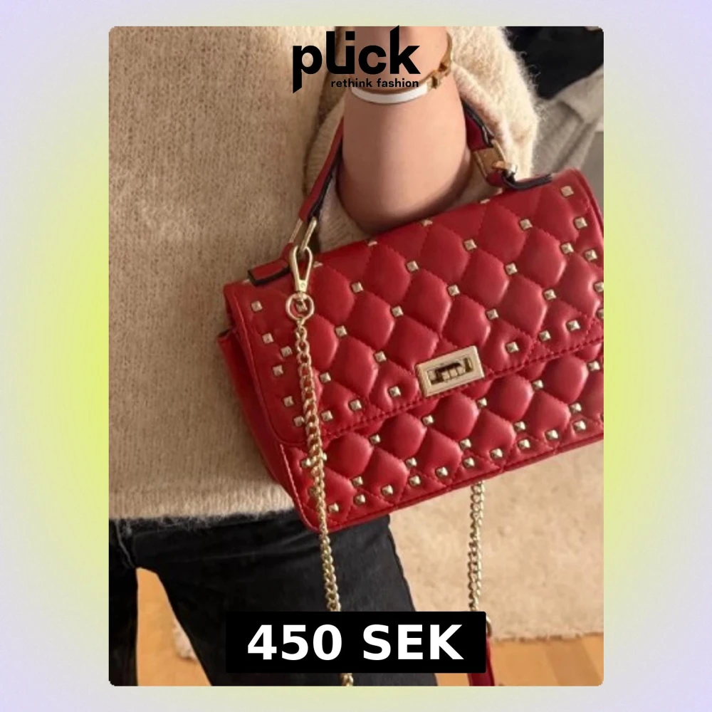 Trendig röd handväska med quiltat mönster och guldfärgade nitar. Väskan har en guldkedja som axelrem och ett vridlås framtill. Perfekt accessoar för att lyfta din outfit med en edgy touch.