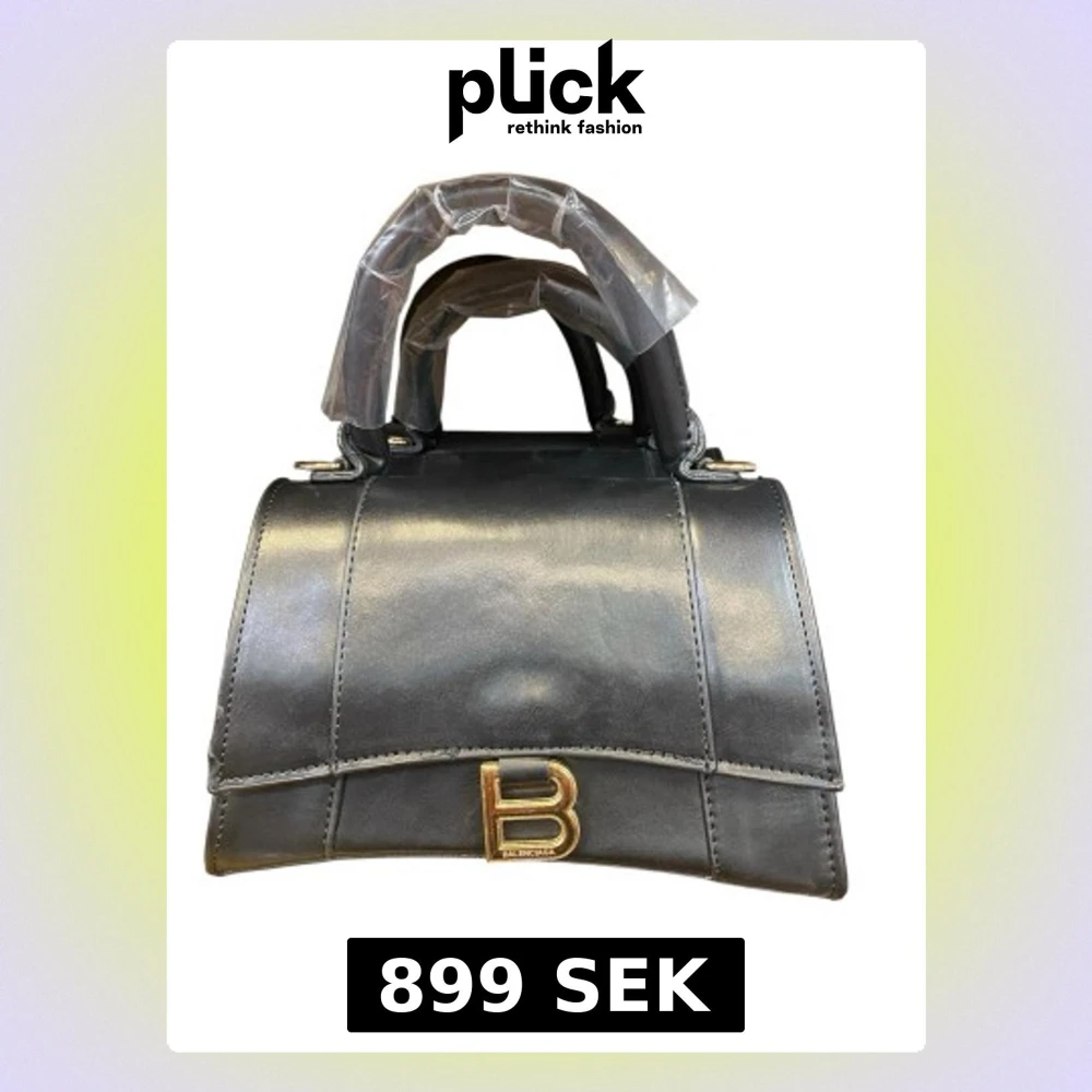 Snygg svart handväska i slätt läder med guldfärgat spänne framtill. Väskan har en stilren, strukturerad form och ett kort handtag. Perfekt för dig som gillar exklusiva accessoarer och vill sticka ut med en ikonisk design.