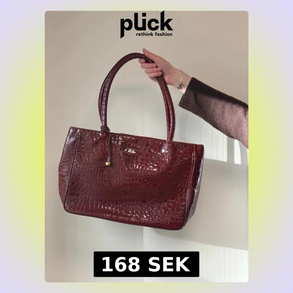 Snygg vinröd handväska i croco-mönstrat konstläder med två rejäla handtag. Väskan har en stilren, fyrkantig form och en liten guldfärgad detalj framtill. Perfekt för dig som vill ha en trendig accessoar med lyxig känsla.