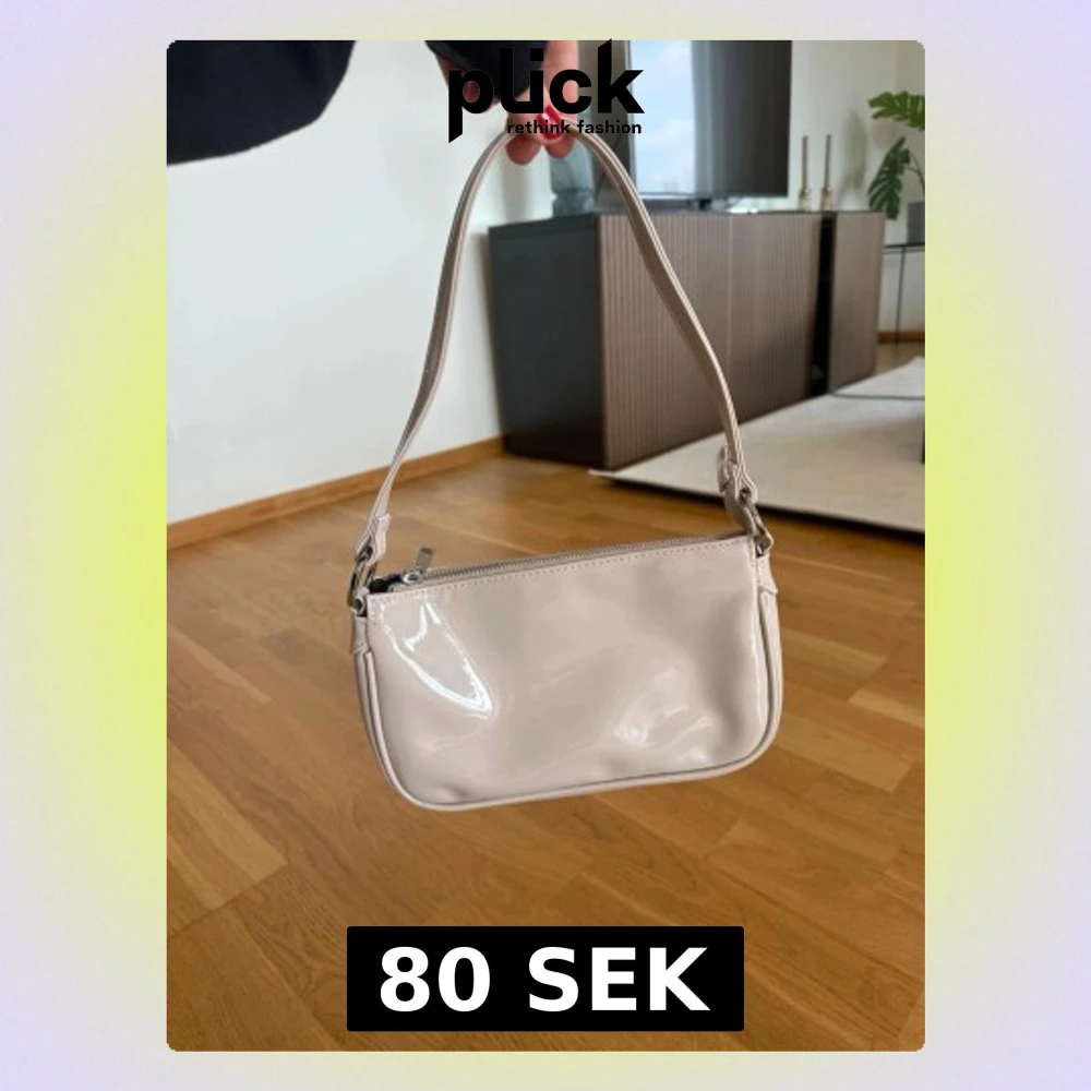 Säljer en stilren beige axelremsväska i glansigt lackmaterial. Väskan har en enkel, rektangulär form med silverfärgade metalldetaljer och dragkedja upptill. Perfekt storlek för det viktigaste och ger en trendig touch till din outfit.