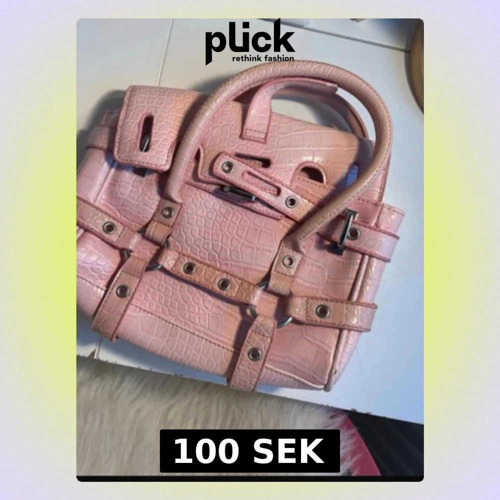 Cool rosa handväska med croco-mönster och silvriga metalldetaljer. Väskan har dubbla handtag och flera dekorativa remmar med nitar och spännen. Perfekt för dig som vill sticka ut med en trendig accessoar.