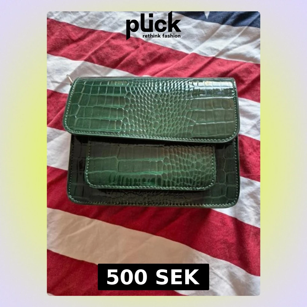 Snygg grön handväska i croco-mönstrat konstläder med två fickor framtill och magnetlås. Väskan har en fyrkantig form och glansig finish som ger en trendig look. Perfekt för dig som vill sticka ut med en cool accessoar.