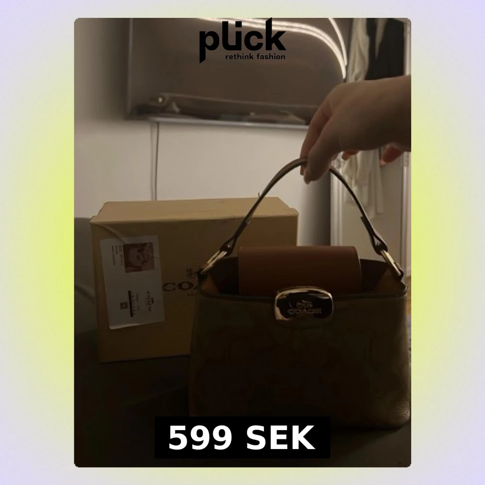 Snygg beige handväska från Coach med klassiskt monogrammönster och guldfärgad logga på framsidan. Väskan har ett kort handtag i brunt läder och detaljer i guldmetall. Perfekt storlek för det viktigaste och ger en lyxig känsla till din outfit.