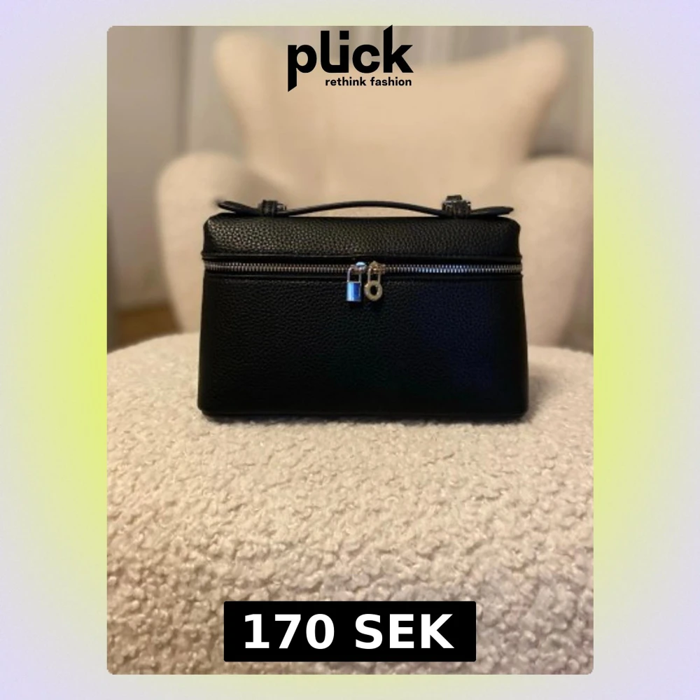 Stilren svart handväska i strukturerat läderimitation med silverfärgade detaljer och dragkedja. Väskan har ett topphandtag och dekorativa låsdetaljer framtill. Perfekt för dig som gillar minimalistisk och modern design.
