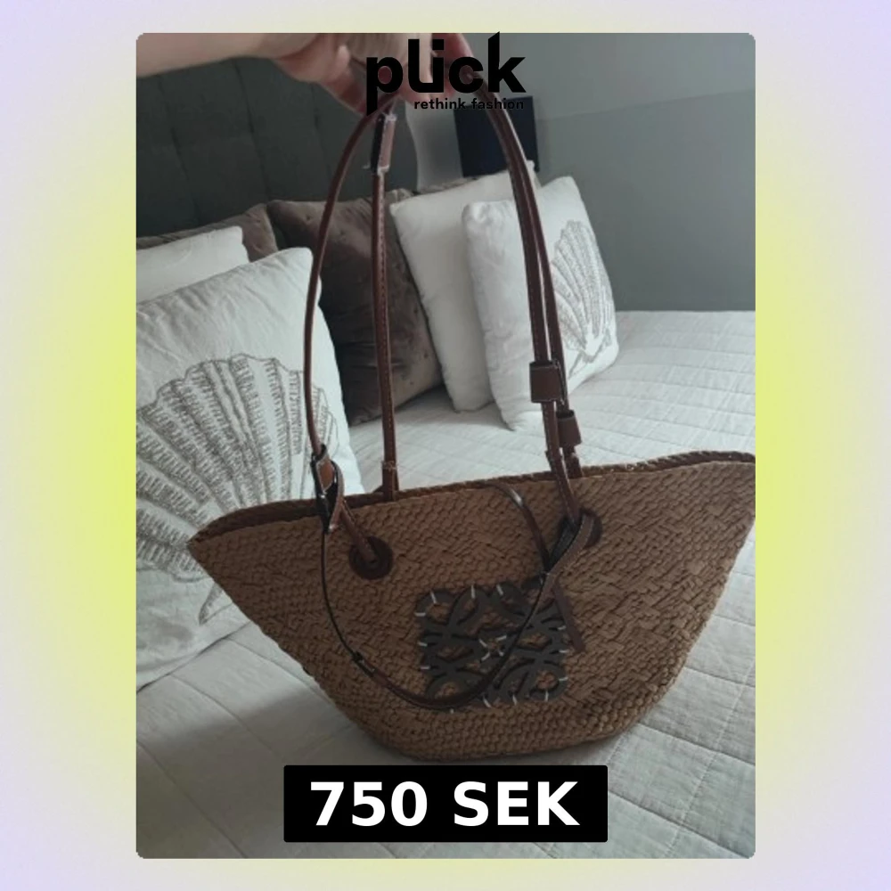 Säljer en snygg stråväska från Loewe med bruna läderhandtag och dekorativt lädermärke framtill. Väskan har en korgformad design och är perfekt för dig som gillar en naturlig och trendig look. Passar till sommarens alla outfits!