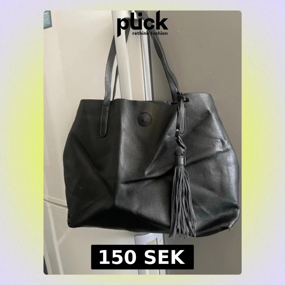 Stilren svart handväska i mjukt konstläder med två axelband och en dekorativ tofs. Väskan har enkel design utan synliga loggor och gott om plats för dina grejer. Perfekt för dig som gillar minimalistisk och trendig look.knappar i sidorna för att förminska/förstora något.