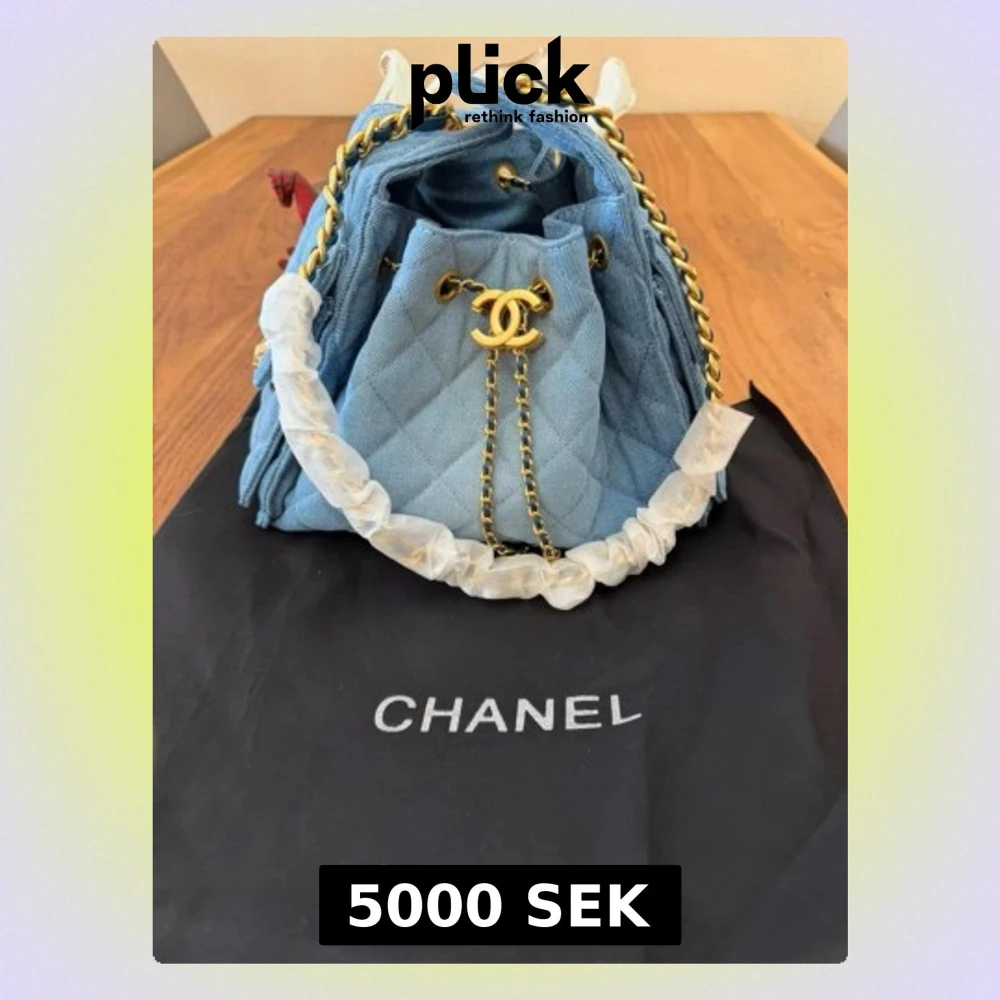 Säljer en snygg blå quiltad handväska i denim med guldfärgade kedjedetaljer och klassisk CC-logga framtill. Väskan har dragskostängning och en ficka på sidan med logga. Perfekt för dig som vill ha en trendig och exklusiv accessoar.