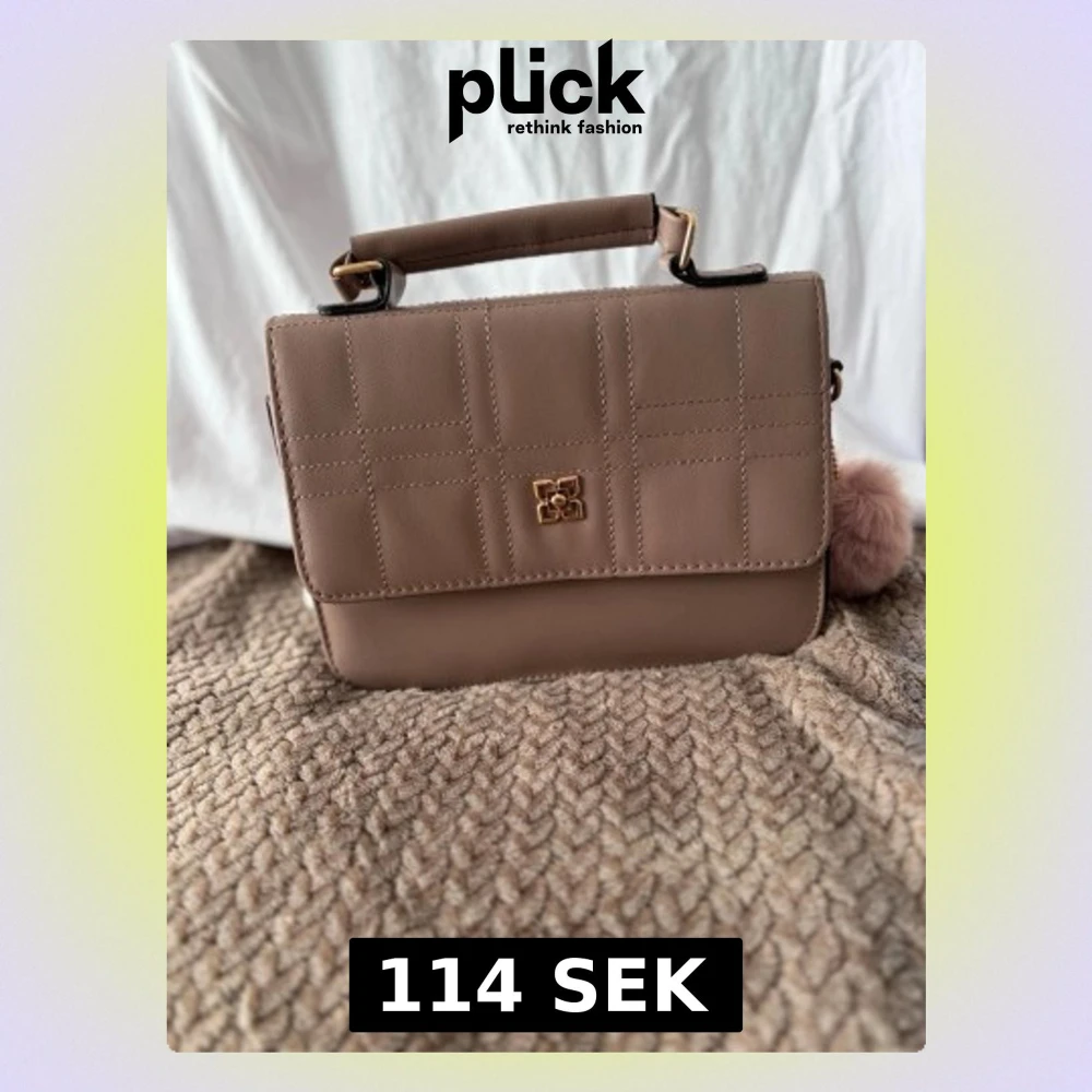 Stilren beige handväska i fyrkantig modell med rutmönster på framsidan och guldfärgad detalj. Väskan har ett kort handtag upptill och en fluffig beige nyckelring som är avtagbar. Tillverkad i slätt konstläder med guldfärgade metalldetaljer.