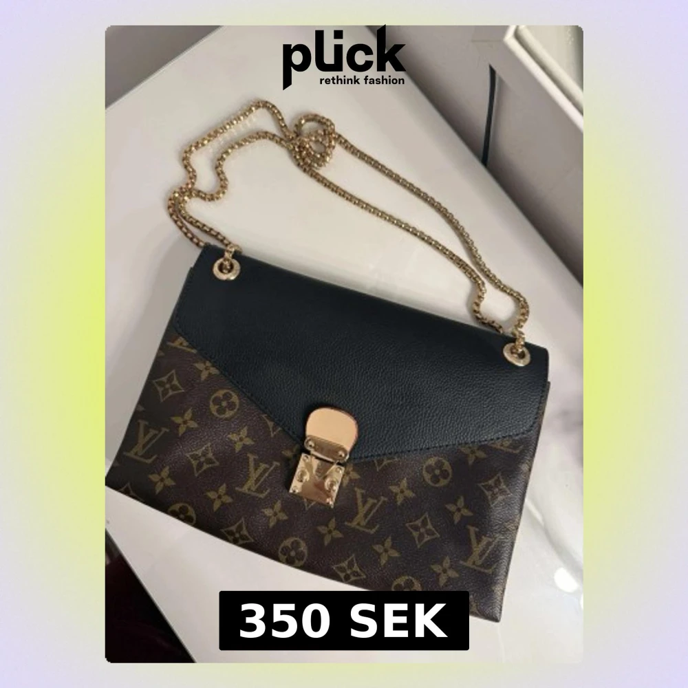 Snygg handväska med klassiskt monogrammönster i brunt och guld. Väskan har svart lock i läder, guldfärgad kedjerem och elegant låsdetalj framtill. Röd på insidan❤️