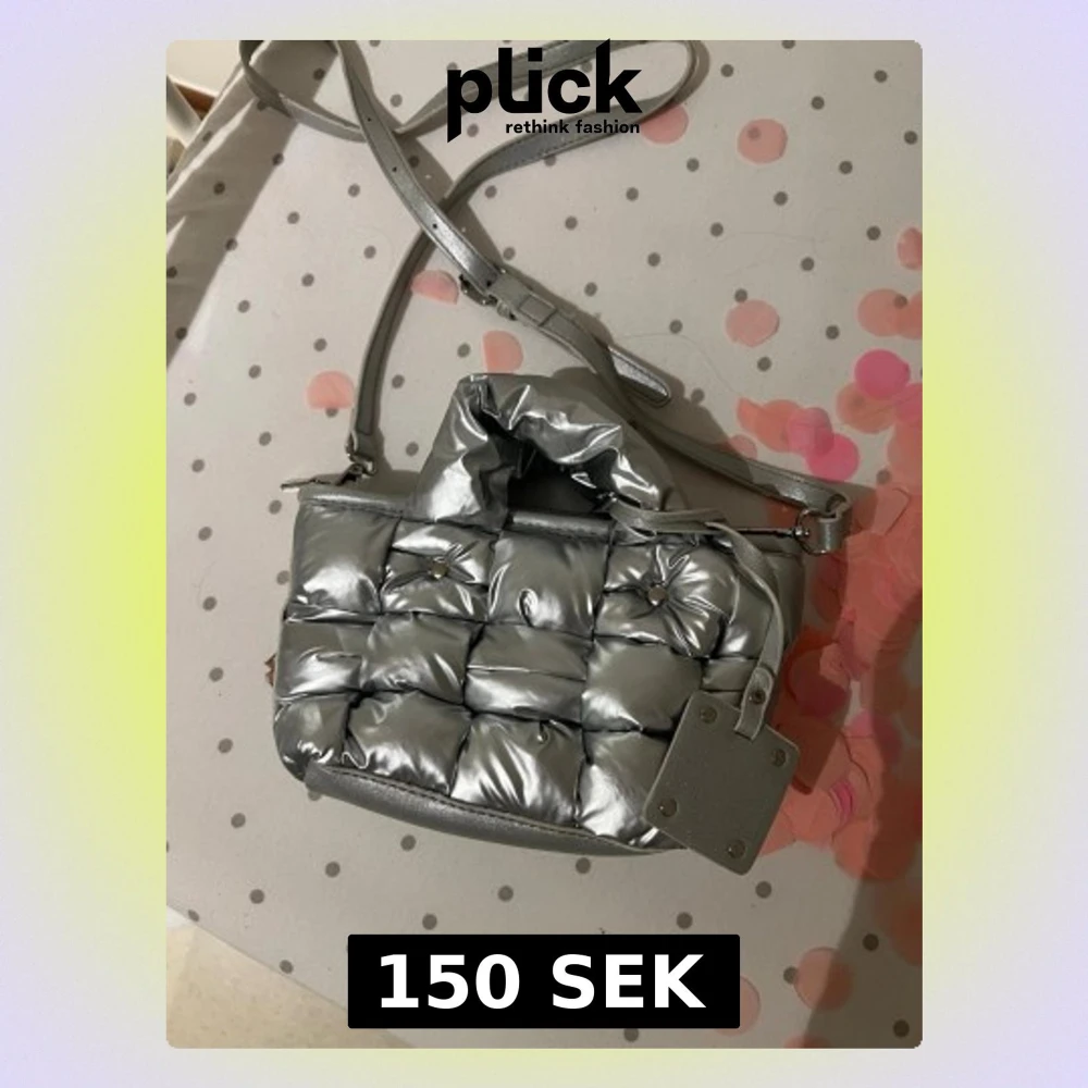 Trendig silvrig handväska med quiltad design och justerbar axelrem. Väskan har en fluffig, vadderad look och ett dekorativt hängande tag. Perfekt för dig som gillar att sticka ut med accessoarer i metallic och modern stil.