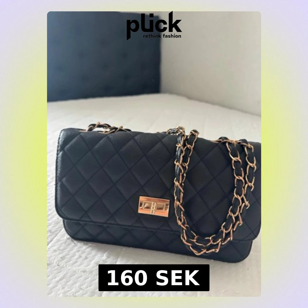 Snygg svart handväska i quiltad design med guldfärgad kedjerem och vridlås. Klassisk rektangulär form och elegant look som passar till många outfits. Väskan har en lyxig känsla tack vare materialet och detaljerna.
