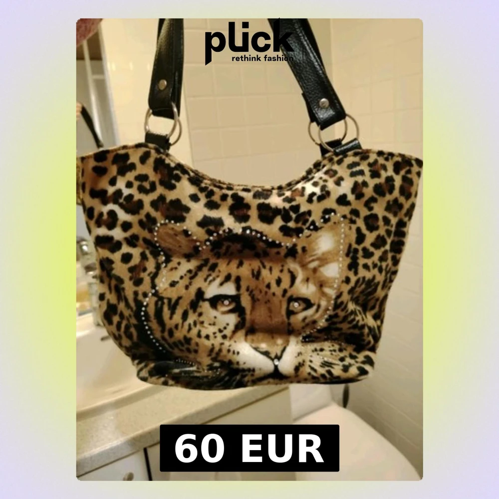 Cool handväska med leopardmönster och ett stort tryck av en leopard på framsidan😍 Väskan har svarta handtag i konstläder och dekoreras med små glittrande stenar runt motivet💎 Perfekt för dig som gillar djurmönster och vill sticka ut❤️🐆 Vintage! (köpt från Finnska Fintage Store)