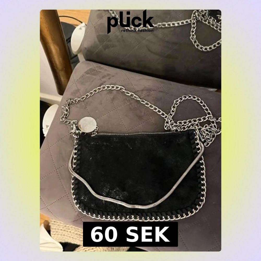 Snygg svart handväska i mockaimitation med silverfärgade kedjedetaljer och axelrem. Väskan har en rund metallbricka och dekorativa sömmar längs kanterna. Perfekt accessoar för en trendig look.