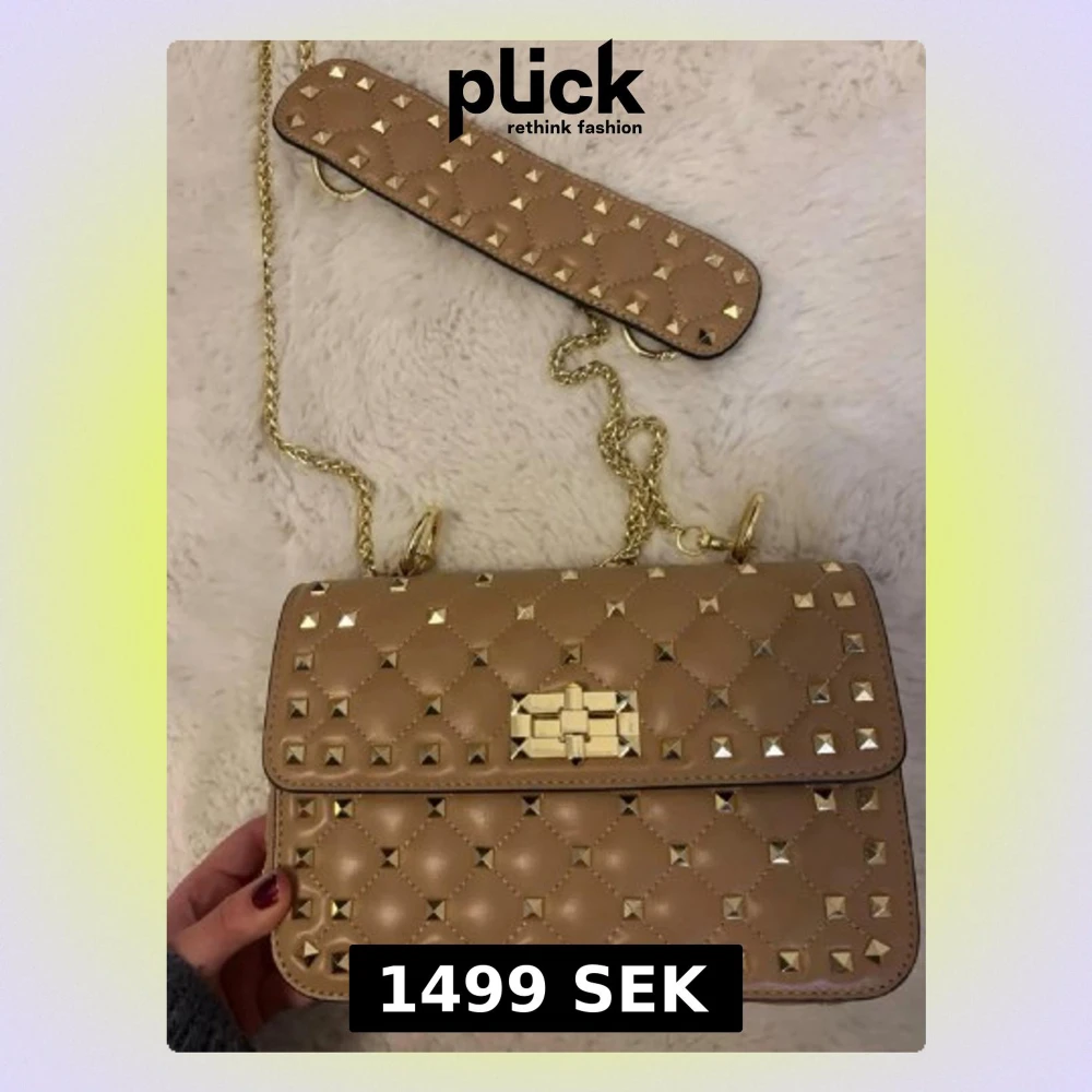 Snygg beige handväska i quiltat läder med guldfärgade nitar och kedja. Väskan har ett dekorativt spänne framtill och avtagbar axelrem med matchande nitar. Perfekt för dig som gillar edgy detaljer och trendig design. Aldrig använd. Hör av er vid frågor ❤️❤️