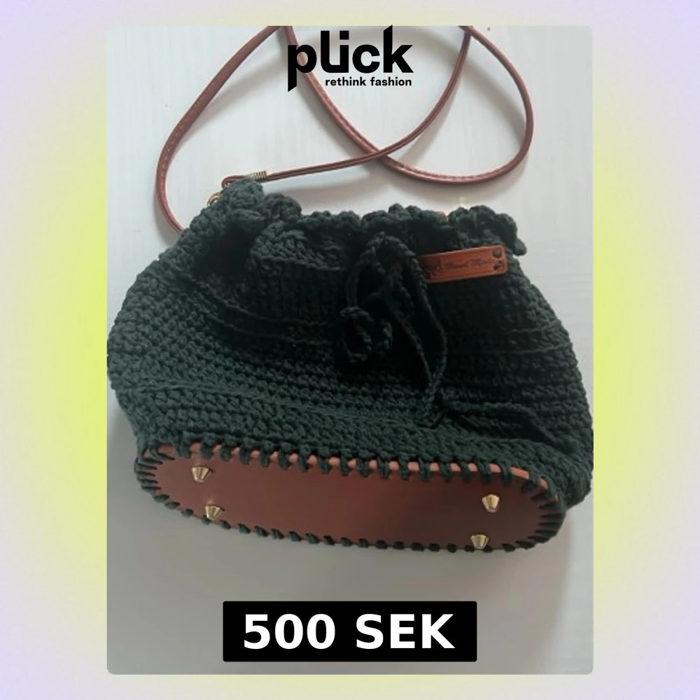 Unik mörkgrön virkad axelväska med brunt läderbotten och guldfärgade nitar. Väskan har dragskostängning och en smal axelrem i brunt läder. Perfekt för dig som gillar handgjorda detaljer och en bohemisk stil.