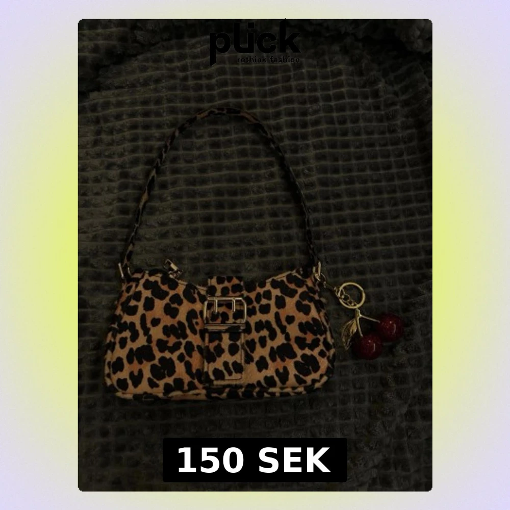 Cool handväska i leopardmönstrat tyg med guldfärgat spänne och matchande axelrem. Väskan har en dekorativ körsbärsnyckelring i rött och guld. Perfekt för dig som vill sticka ut med ett djurmönster och snygga detaljer.