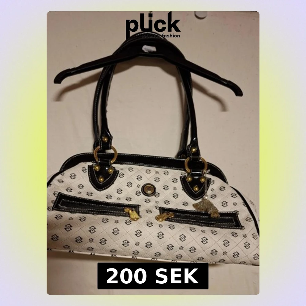 Snygg vit handväska med svart S-mönster och svarta detaljer. Väskan har två framfickor med guldfärgade dragkedjor och dubbla handtag i svart konstläder med guldfärgade ringar. Klassisk och trendig design som sticker ut.