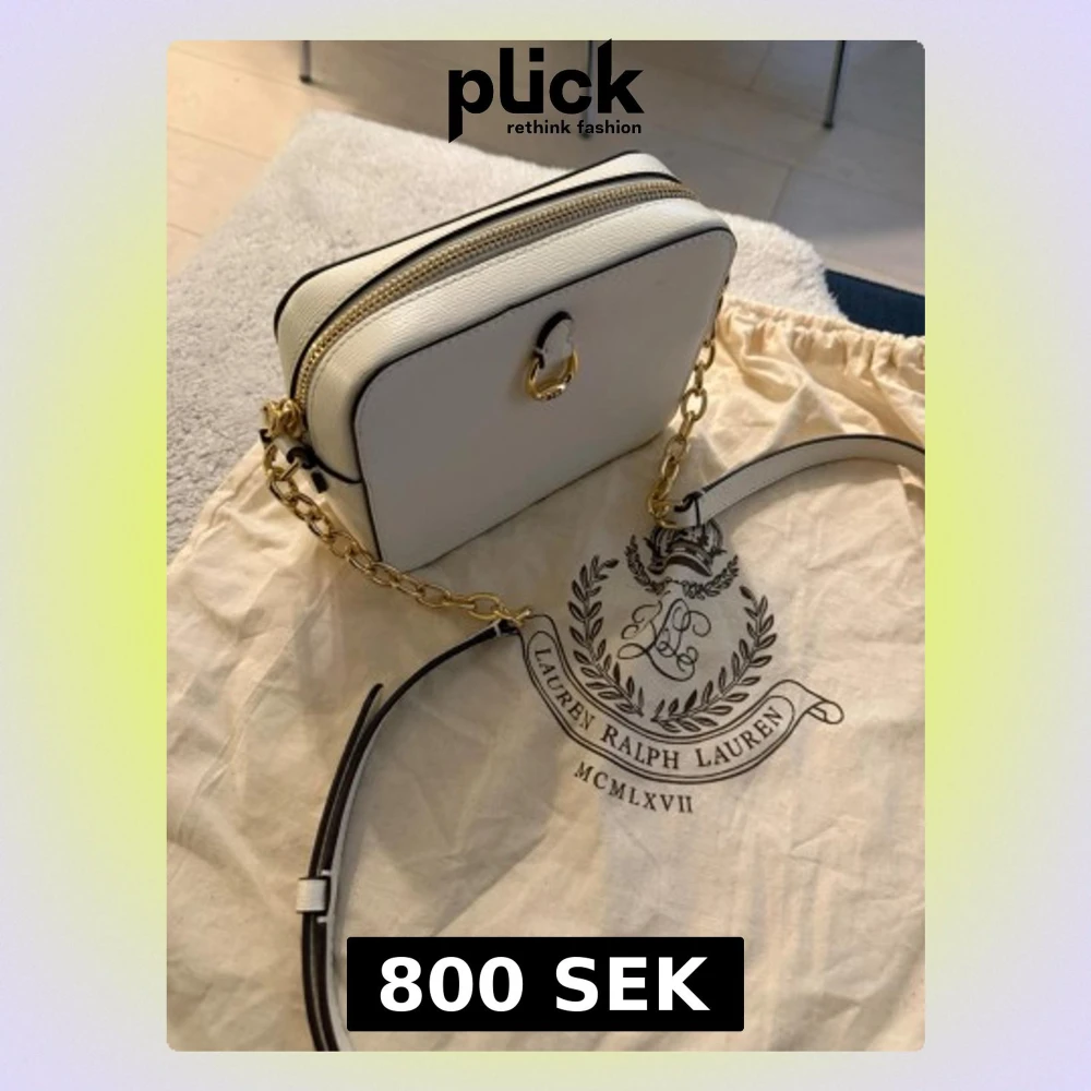 Säljer en stilren vit handväska från Lauren Ralph Lauren i fyrkantig modell. Väskan har guldfärgade metalldetaljer, kedja och justerbar axelrem i läder. Dragkedja upptill och elegant präglad struktur. Perfekt accessoar för en trendig look.