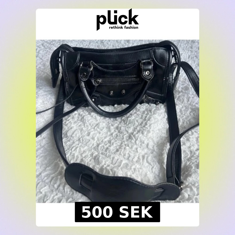 Säljer en svart handväska i mjukt läder. Väskan har både handtag och lång axelrem, silverfärgade detaljer, dragkedja framtill och dekorativa nitar. Perfekt för dig som gillar en edgy och trendig look.