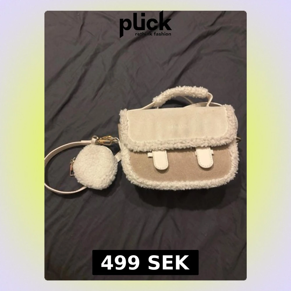 Söt handväska i beige och vitt med fluffiga detaljer och matchande axelrem. Väskan har ett litet fack framtill och ett gulligt, fluffigt myntfodral som hänger på remmen. Materialet är en mix av mockaimitation och teddy, perfekt för dig som gillar mysiga accessoarer.