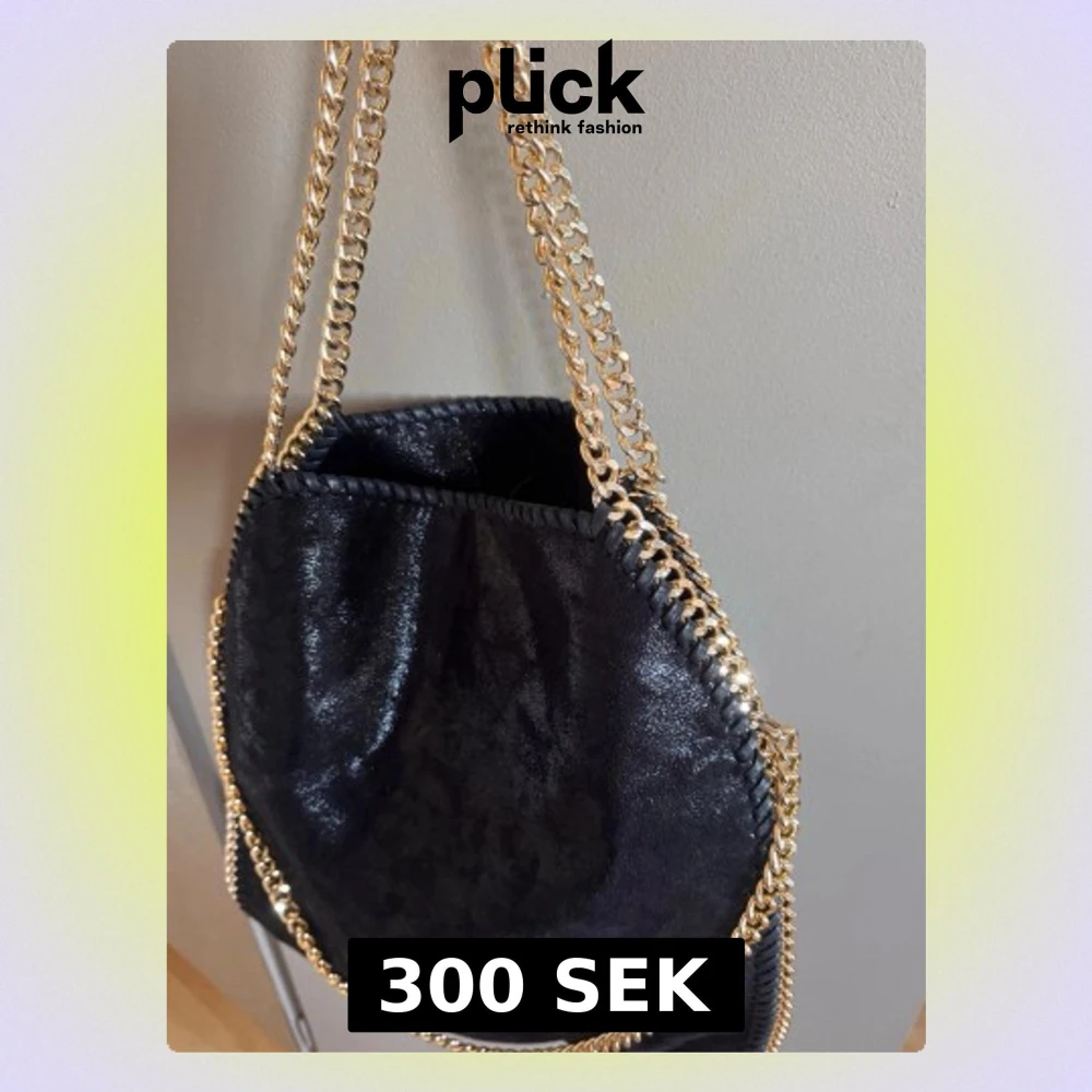 Snygg svart handväska i glansigt material med dekorativa guldfärgade kedjor som axelband och runt kanterna.