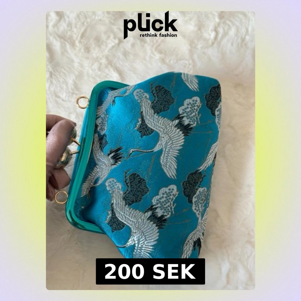 Unik blå handväska med broderade tranor och moln i silver och svart. Väskan har metallram i matchande turkos och guldfärgade detaljer. Materialet är glansigt tyg med asiatiskt inspirerat mönster. Perfekt för dig som vill sticka ut med en färgstark accessoar.
