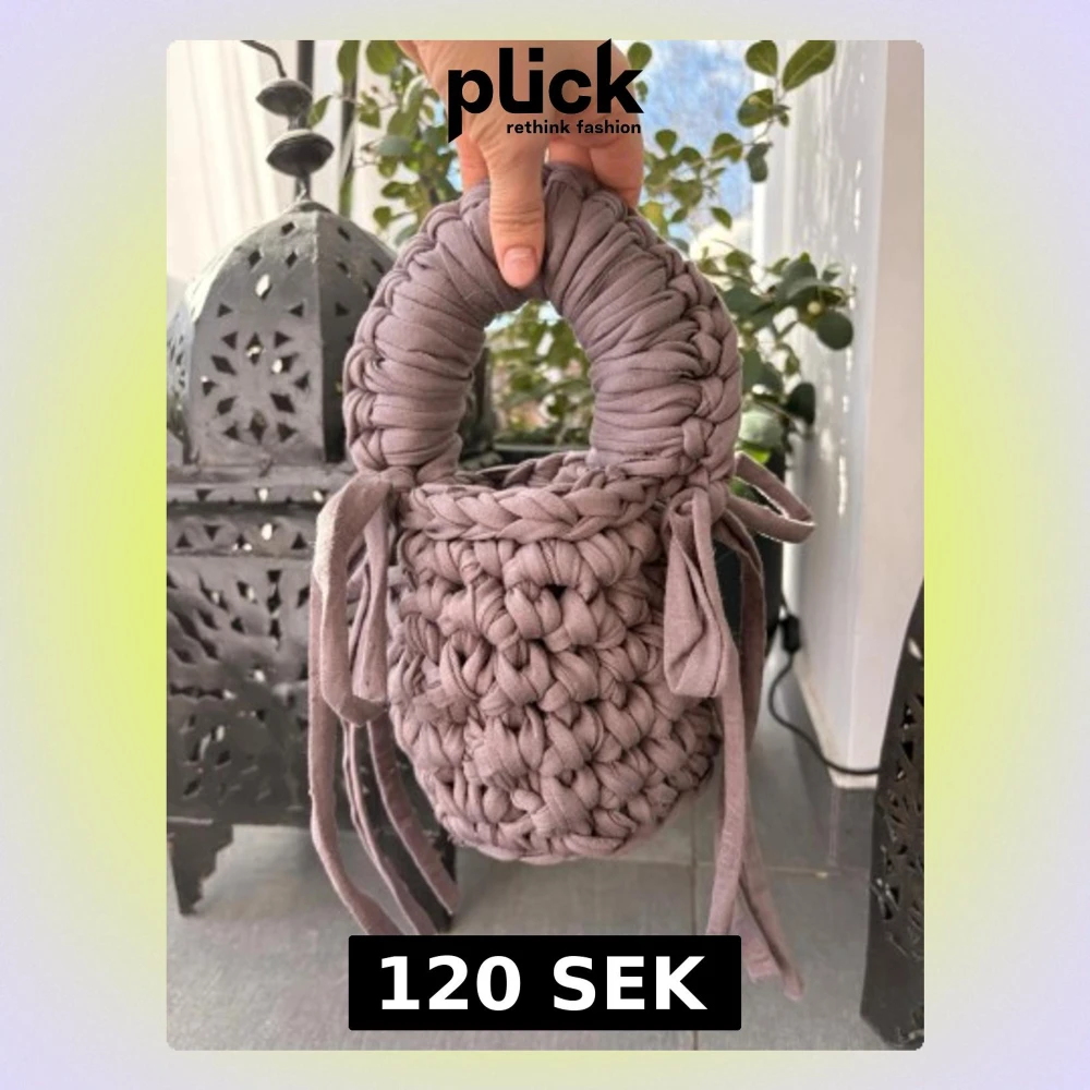 Unik handvirkad handväska i lila tyg med chunky struktur och cylinderform. Väskan har ett tjockt handtag och dekorativa knytband på sidorna. Perfekt för dig som gillar statement-accessoarer och vill sticka ut med en kreativ look.