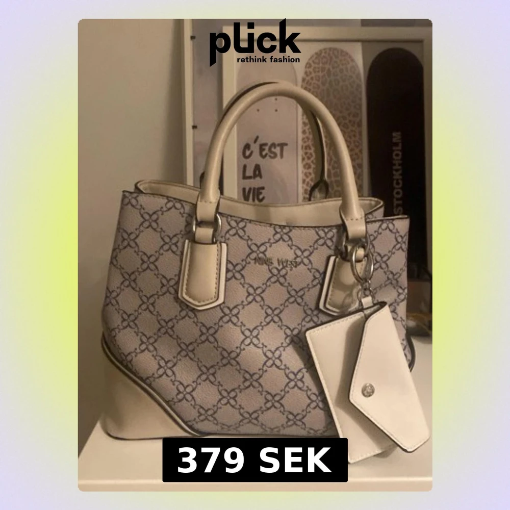 Snygg handväska från Nine West i beige och ljusgrått med mörkblått mönster. Väskan har två korta handtag, dekorativ tag och flera innerfack, inklusive ett med dragkedja. Tillverkad i konstläder med silverfärgade detaljer. Perfekt för dig som gillar stilrena accessoarer. Orginal pris 1200kr