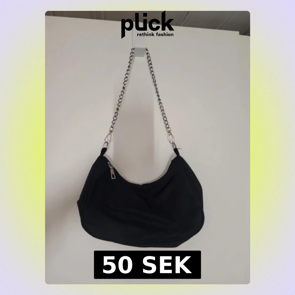 Trendig svart handväska i mjukt tyg med silverfärgad kedjerem och dragkedja upptill. Väskan har en rundad form och minimalistisk design som passar till många olika stilar. Perfekt för dig som gillar en enkel men cool look.