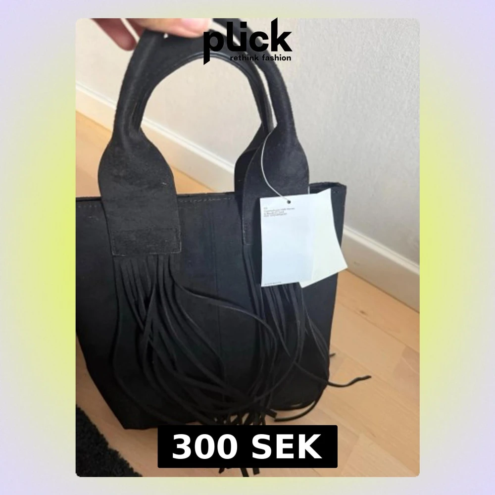 Stilren svart handväska från H&M Divided med coola fransdetaljer framtill. Väskan har två rejäla handtag och är gjord i ett mockaliknande material. Perfekt accessoar för att lyfta din outfit med en trendig touch.
