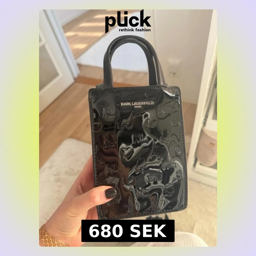 Snygg svart minihandväska från Karl Lagerfeld i glansigt lackmaterial med präglade loggor och motiv. Väskan har två små handtag och en stilren, boxig form. Perfekt för dig som gillar statement-accessoarer och vill ha något trendigt och unikt. Denna design finns inte att hitta längre! Helt ny☺️