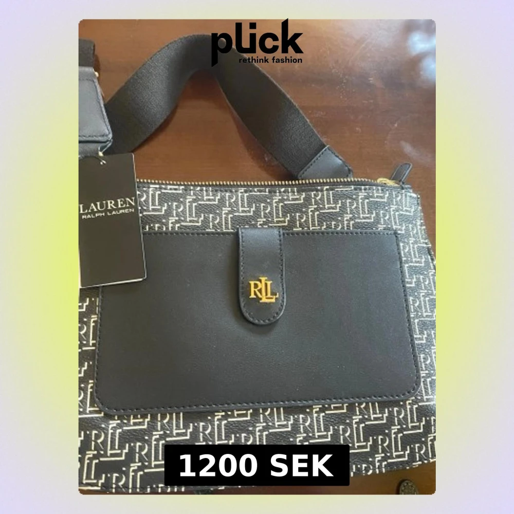Snygg svart handväska från Ralph Lauren med RL-logga i guld på framsidan. Väskan har ett mönstrat tyg med RL-bokstäver och en bred axelrem. Framsidan har ett stort fack med lock och guldfärgad detalj. Perfekt för dig som gillar stilrena accessoarer.