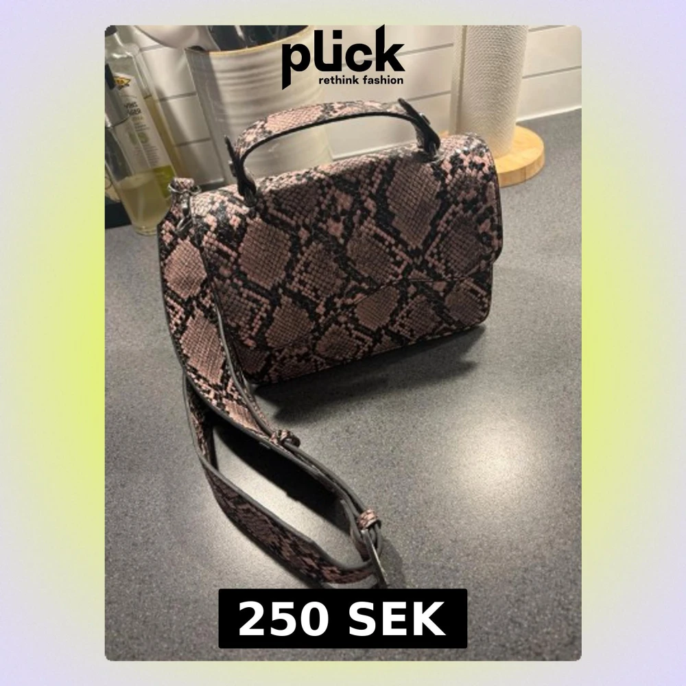 Säljer en snygg handväska i rosa och svart ormmönstrat konstläder. Väskan har både handtag och justerbar axelrem, perfekt för att bära på olika sätt. Stilren och trendig design med lock och magnetknäppning. Perfekt accessoar för att lyfta din outfit.