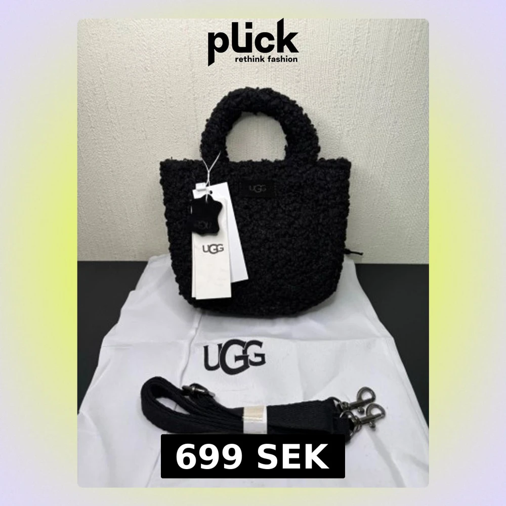 Snygg svart handväska från UGG i mjukt teddy-material. Väskan har rundade handtag, avtagbar axelrem och UGG-logga framtill. Perfekt för dig som gillar trendiga accessoarer med mysig känsla. Levereras med dustbag och taggar kvar.