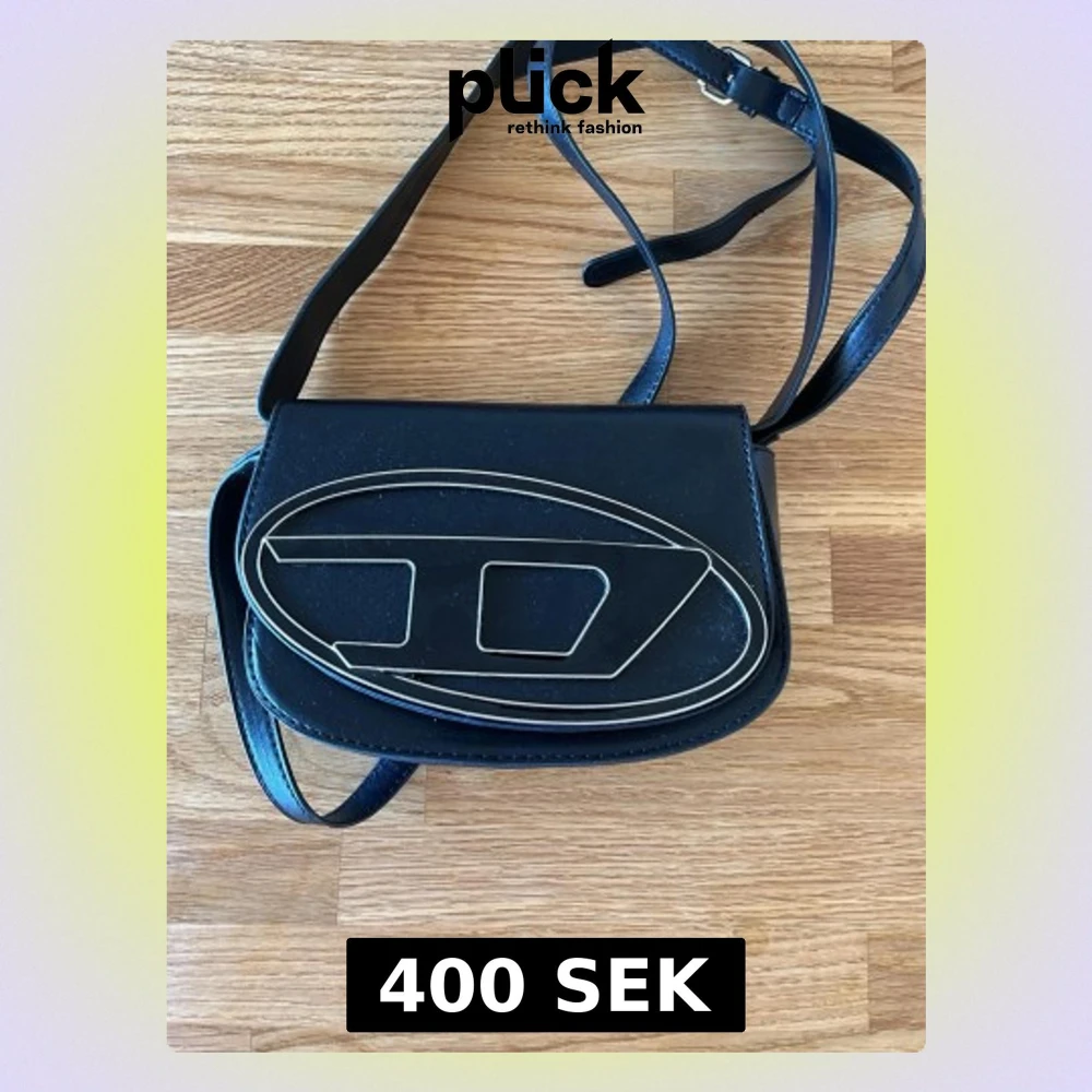Cool svart axelväska i slätt läder från Diesel med justerbar rem och ett stort, stilrent logomönster på framsidan. Väskan har en rundad form och stängs med lock. Perfekt för dig som gillar unik design och vill sticka ut.