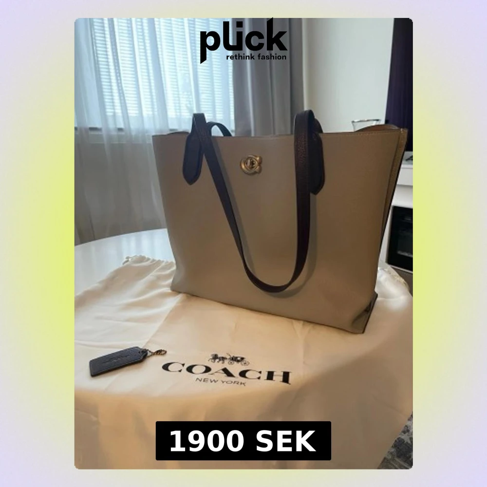 Stilren beige väska från Coach med mörkbruna handtag och guldigt spänne. Väskan har ett rymligt huvudfack och en innerficka med dragkedja i klassiskt Coach-mönster. Tillverkad i slätt läder och perfekt för dig som gillar snygg och praktisk design. Jätte bra skick, som ny. Inga defekter. Bredd: 35cm, höjd: 28 cm, djup: 15 cm.