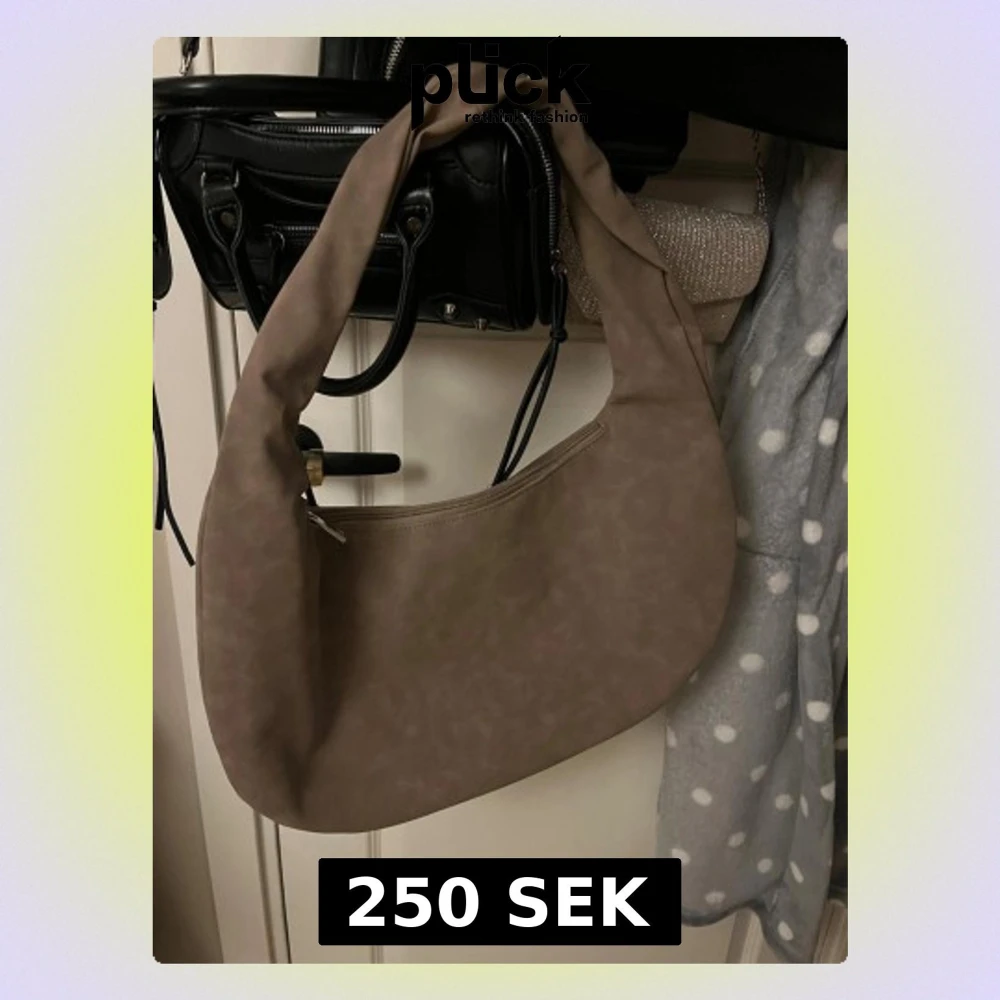 Säljer en beige axelremsväska i mjukt, matt material med minimalistisk design. Väskan har en böjd, halvmåneformad siluett och dragkedja upptill. Perfekt för dig som gillar stilrena accessoarer med en modern touch.