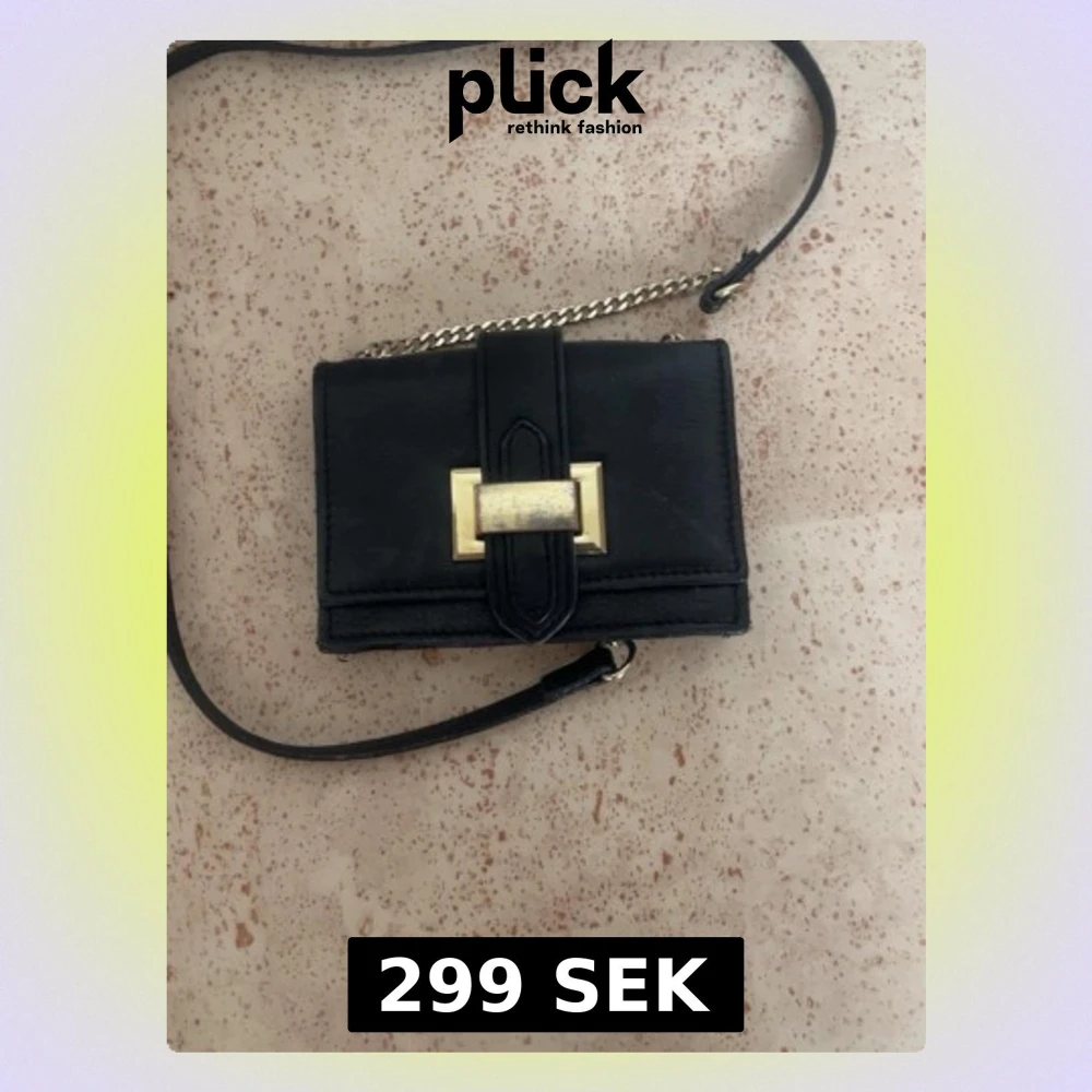 Snygg svart miniväska från DAY ET med guldfärgade detaljer och kedja. Väskan har ett stilrent rektangulärt format, dekorativt spänne framtill och justerbar axelrem i både läder och metall. Perfekt för dig som gillar minimalistisk och trendig design.
