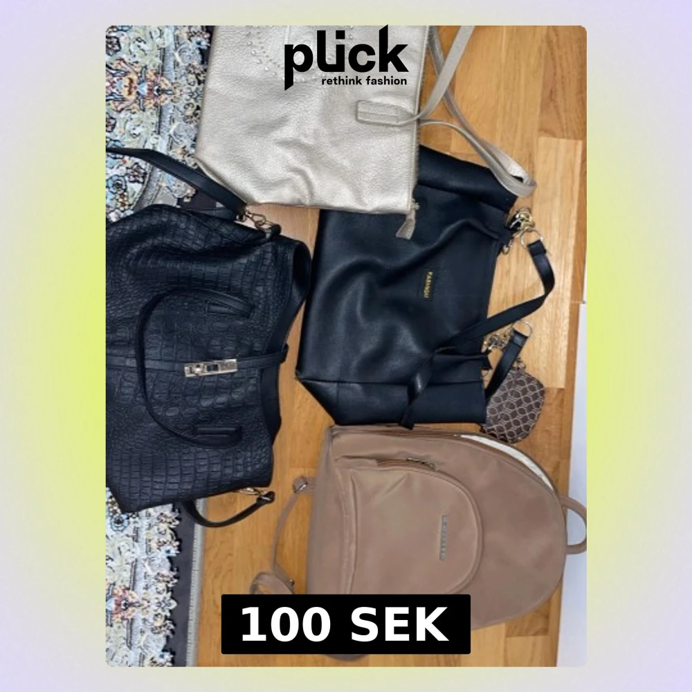 Jag säljer fyra praktiska och snygga väskor som passar både vardag och fest. ✨ Beige shopper Rymlig och elegant med dragkedja – perfekt för jobb, skola eller shopping. ✨ Svart handväska Klassisk modell med strukturerad design. Passar till alla outfits. ✨ Svart crossbody-väska Smidig och lätt med justerbar axelrem – perfekt när du vill ha händerna fria. ✨ Beige ryggsäck Bekväm och praktisk med flera fack. Perfekt för vardag och resor.