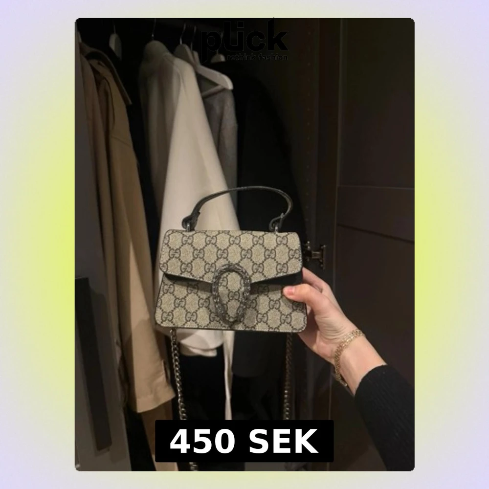Säljer en beige handväska med klassiskt GG-mönster i canvas och detaljer i silverfärgad metall. Väskan har ett top handtag och en kedjerem för axeln. Ikoniskt spänne framtill och stilren, boxig form.