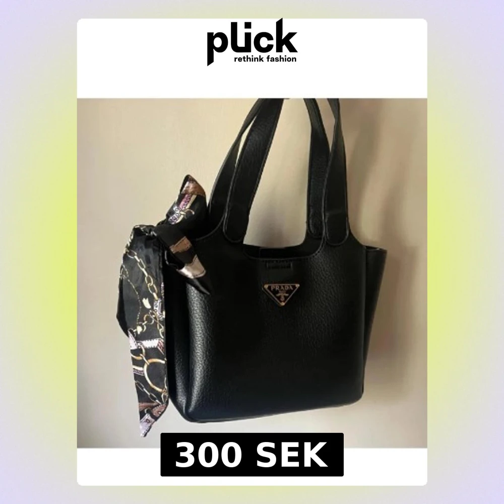 Snygg svart handväska från Prada i strukturerat läder med dubbla handtag. Väskan har en dekorativ scarf i svart, lila och guldmönster knuten på sidan samt den klassiska Prada-loggan i metall framtill. Perfekt accessoar för att lyfta din outfit.
