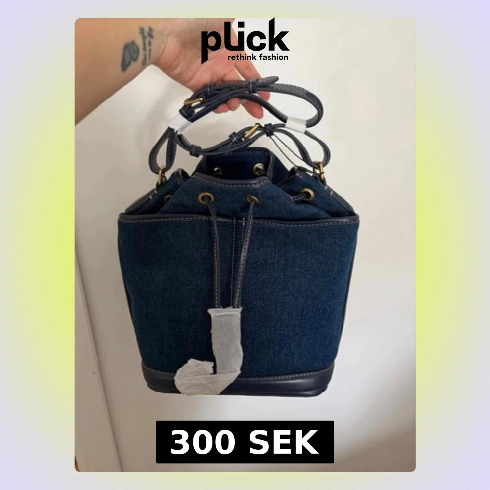 Snygg mörkblå bucket bag från Zara i denim med detaljer i mörkt konstläder. Väskan har guldfärgade metalldetaljer, dragskostängning och dubbla handtag. Perfekt för dig som gillar trendiga accessoarer med en cool touch.
