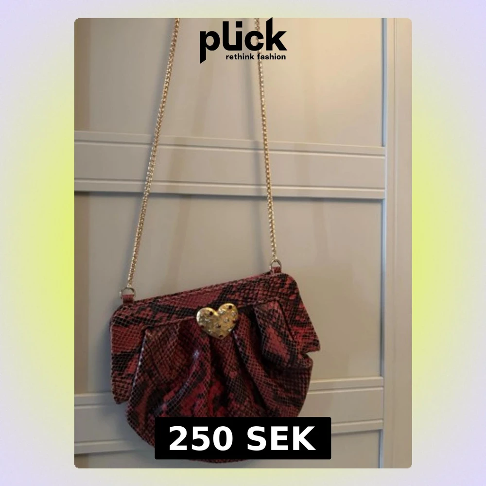 Cool handväska i rött och svart ormmönstrat material med en glansig finish. Väskan har en guldfärgad kedjerem och ett hjärtformat guldfärgat spänne framtill. Unik form med veckad design som ger extra attityd.
