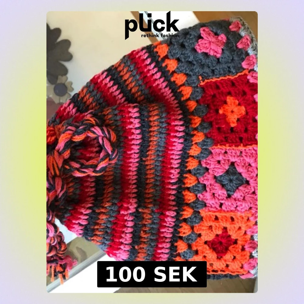 Unik handvirkad mössa i starka färger som rött, orange, rosa och mörkgrått. Mössan har ett randigt och rutigt mönster samt en stor tofs upptill. Perfekt för dig som vill sticka ut och gillar retrovibbar. Materialet är mjukt garn, troligen akryl eller ullblandning.