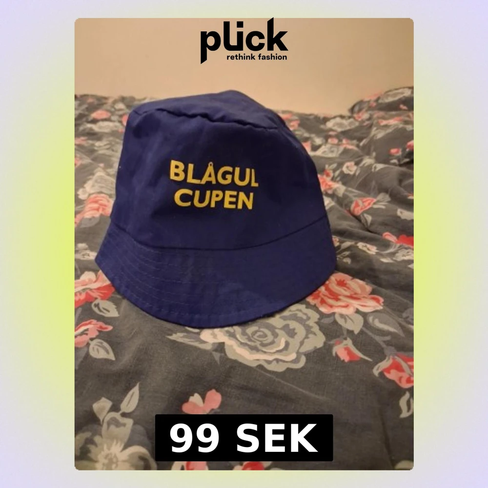 Snygg blå bucket hat med gul text 'BLÅGUL CUPEN' broderat framtill. Klassisk form med bred brätte och sydda sömmar. Tillverkad i ett lätt tyg, perfekt för att lyfta din stil på sommaren eller festivalen.