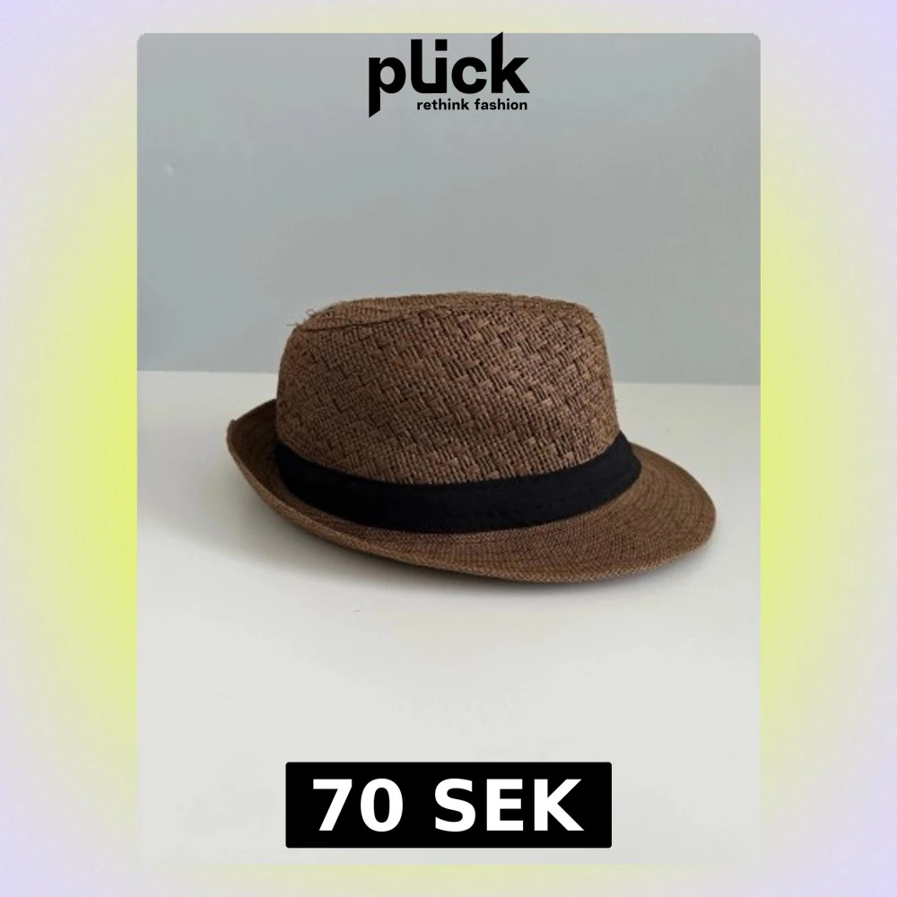 Snygg brun stråhatt i storlek 60 med klassiskt svart band runt kullen. Hatten har ett flätat mönster och en kort brätte som ger en cool och avslappnad look. Perfekt accessoar för soliga dagar och festivaler.