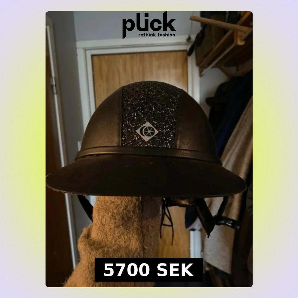 Snygg svart ridhjälm från Charles Owen med glittrig detalj längs mitten och klassisk form. Hjälmen har ett justerbart hakband och en diskret logga framtill. Perfekt för dig som vill sticka ut i stallet med stilren och säker look.