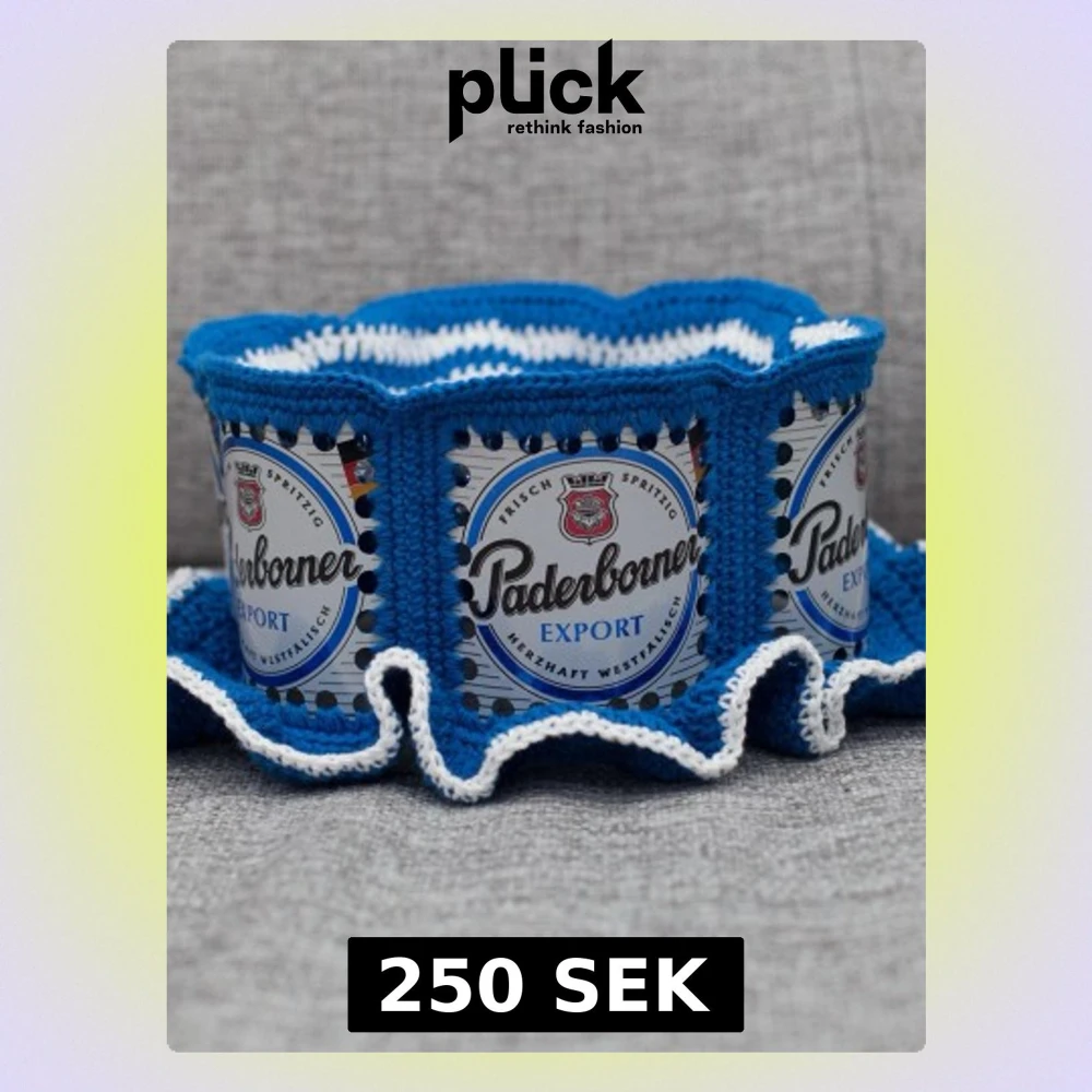 Unik virkad ölhatt med Paderborner. Virkad i 100% bomull. Passar upp till 57cm. Vissa burkar kan ha mindre repor eller bucklor, vilket tyvärr kan uppstå under tillverkningen av hattarna. Insidan av burkarna slipas efter hålen tagits för att undvika vassa kanter. Därför kan det ibland finnas lite slipmärken, men det är inget som stör eftersom det är på insidan av hattarna. Färger kan variera något beroende på skärminställningar.