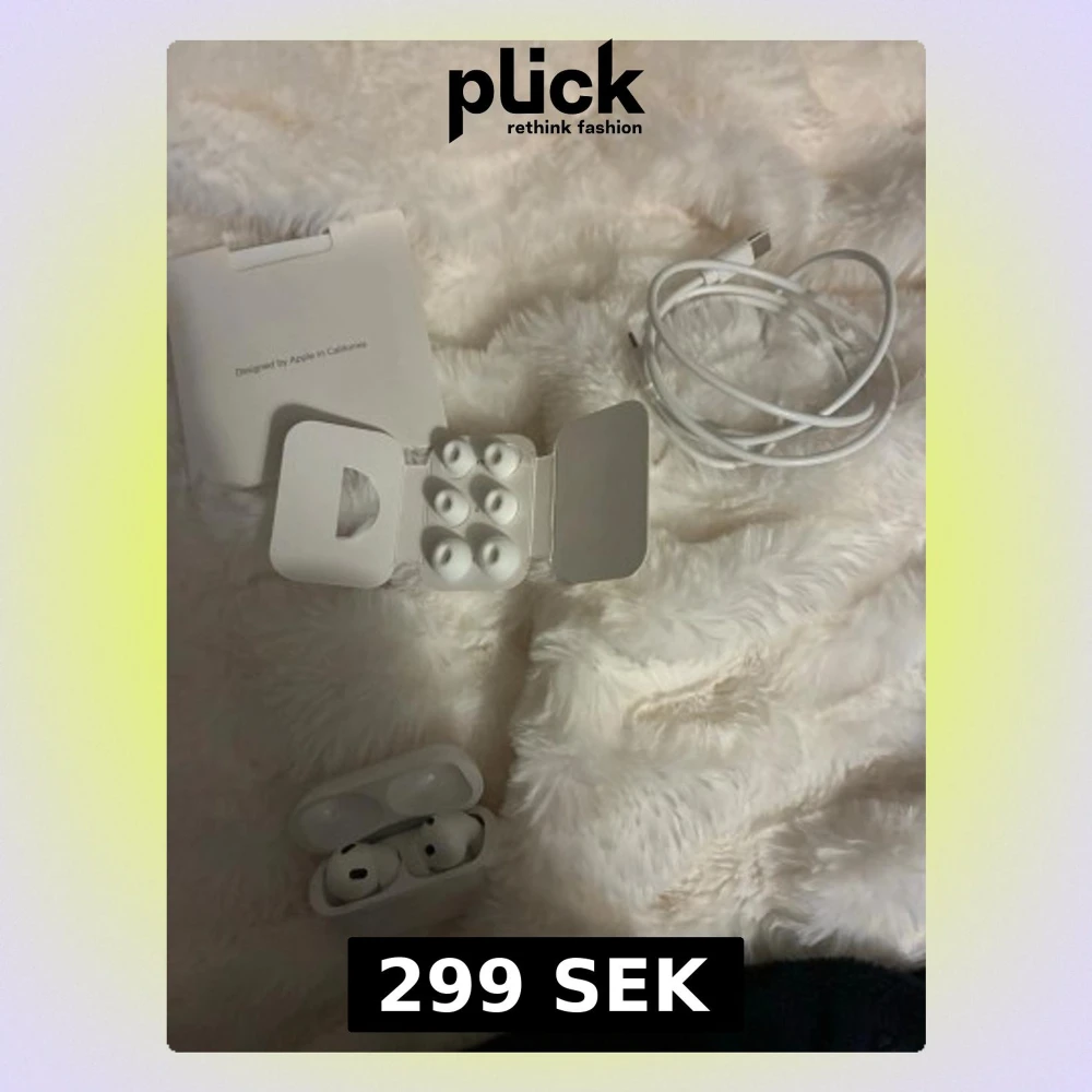 Säljer ett par vita Apple AirPods Pro med trådlöst laddningsetui. Inkluderar extra silikonpluggar i olika storlekar och laddningskabel. Snygg och kompakt design i blankt plastmaterial, perfekt för dig som vill ha grymt ljud och smidig anslutning till din iPhone.1:1